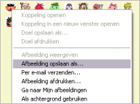 1. Kies een mooie emoticon uit en klik daar met je rechter muisknop op. Kies voor "Afbeelding opslaan als..." (Bij een Engelse Windows versie "Save picture as..."). Er verschijnt nu een schermpje waar je moet aangeven waar je de emoticon wilt opslaan. Kies hier een plek die je ook weer makkelijk kunt terugvinden.